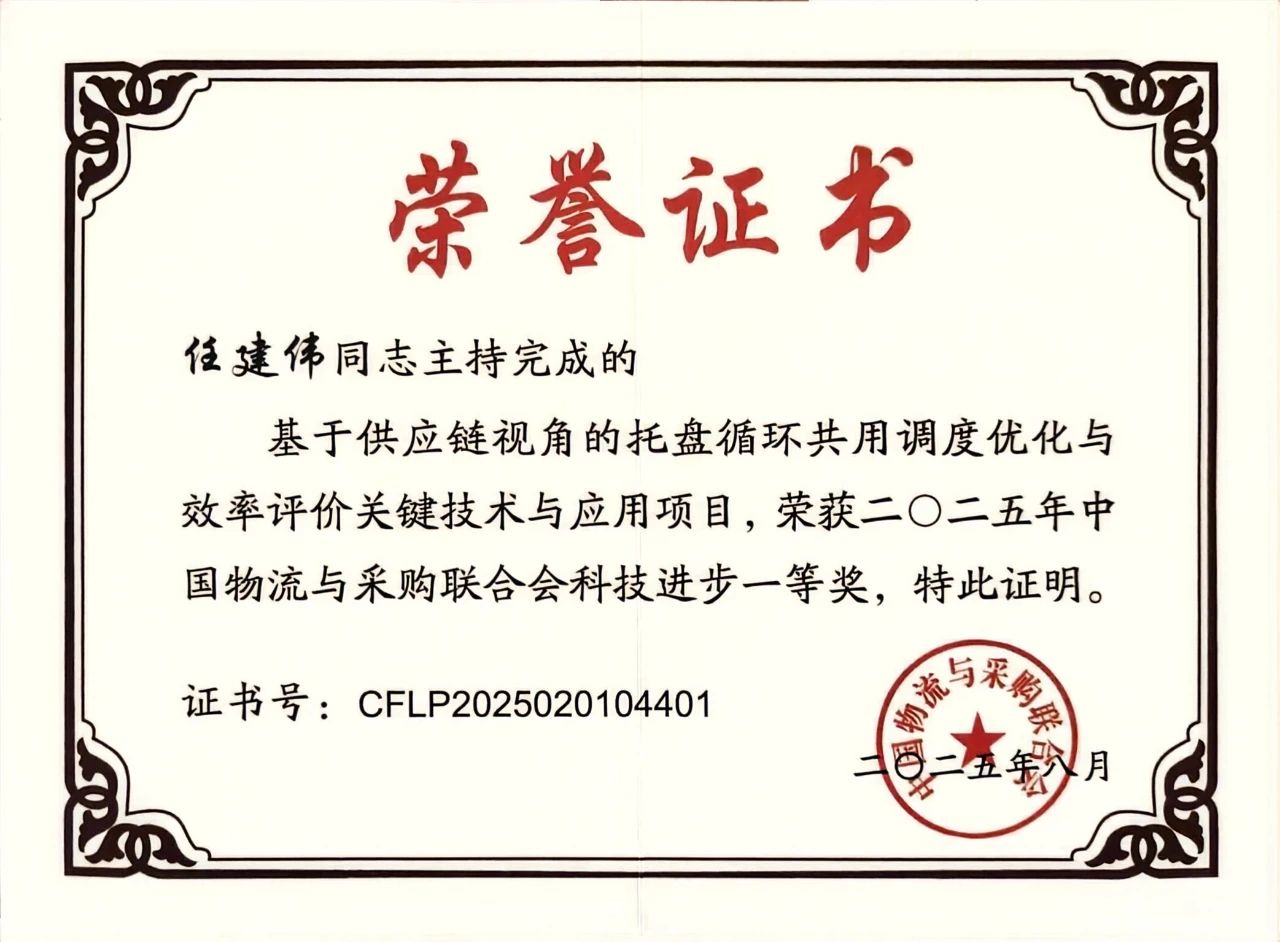 近日,中國物流與采購聯(lián)合會(CFLP)正式公布了2025年度科學技術(shù)獎評審結(jié)果。我院任建偉教授團隊的研究成果“基于供應(yīng)鏈視角的托盤循環(huán)共用調(diào)度優(yōu)化與效率評價關(guān)鍵技術(shù)與應(yīng)用”榮獲科技進步獎一等獎。成果主要完成人:任建偉、李成兵、陳春花、孫哲、徐鐵、李一川、閆振英、霍月英、張鵬、魏中華、喬曉波。